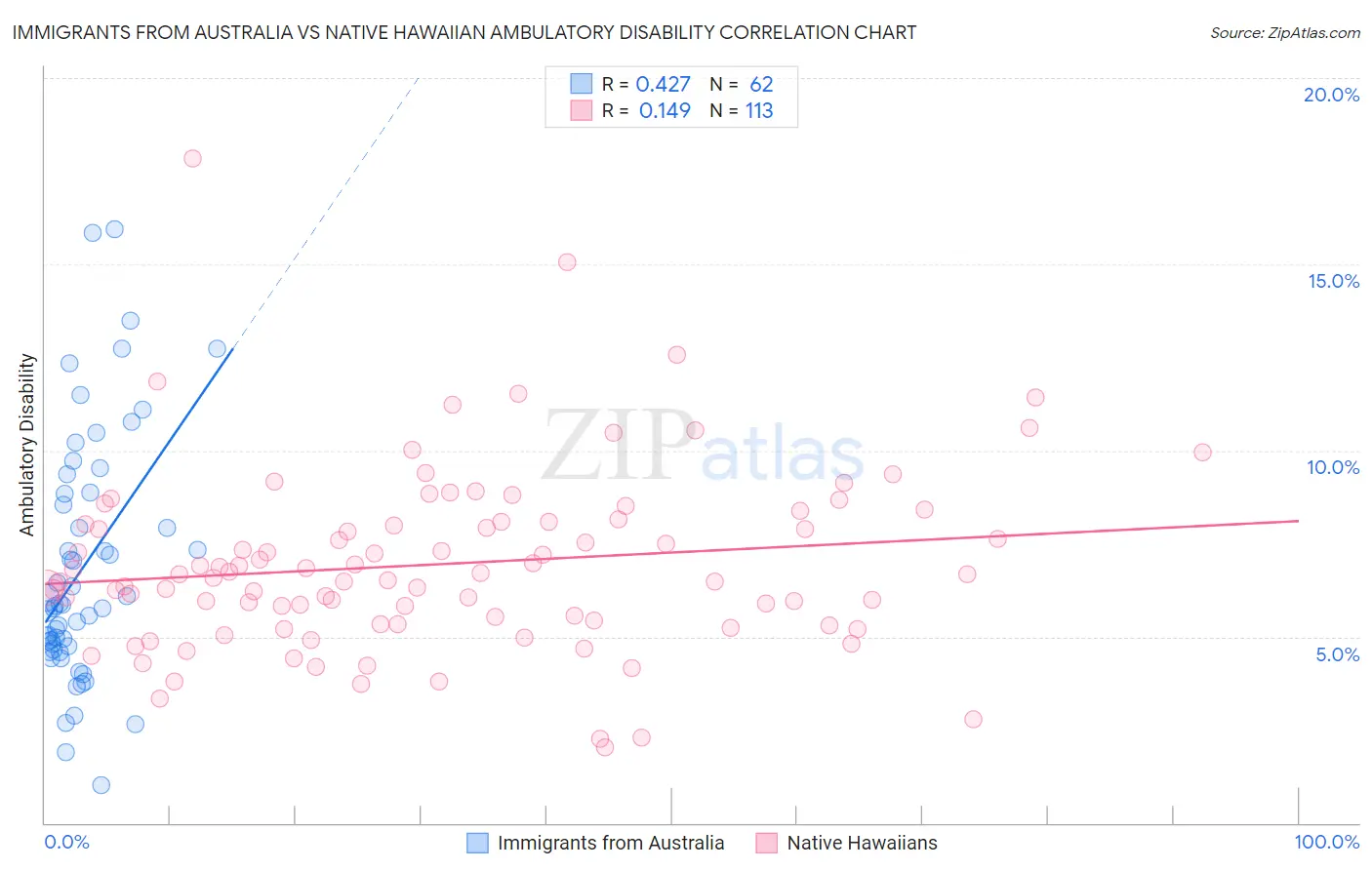 Immigrants from Australia vs Native Hawaiian Ambulatory Disability Correlation Chart