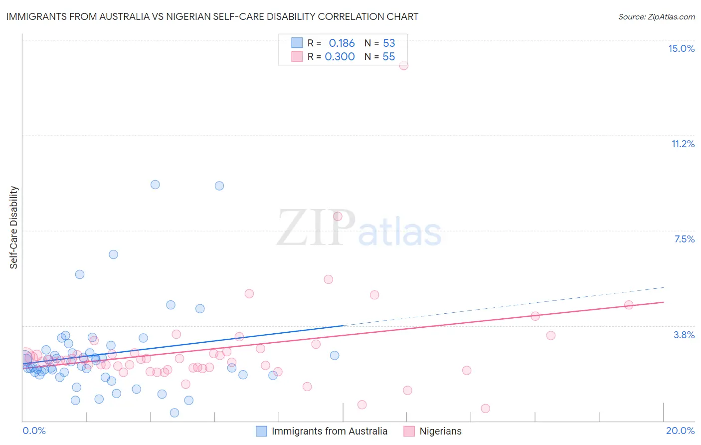 Immigrants from Australia vs Nigerian Self-Care Disability Correlation Chart