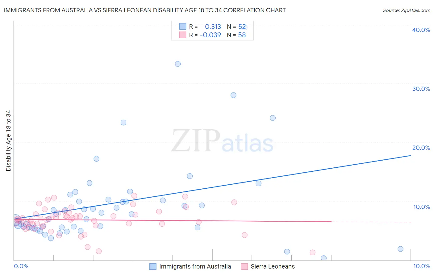 Immigrants from Australia vs Sierra Leonean Disability Age 18 to 34 Correlation Chart
