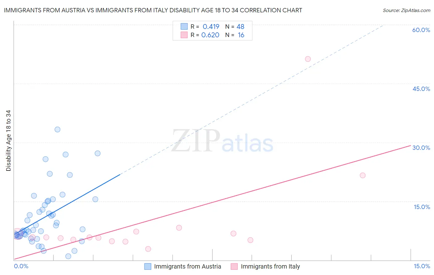 Immigrants from Austria vs Immigrants from Italy Disability Age 18 to 34 Correlation Chart