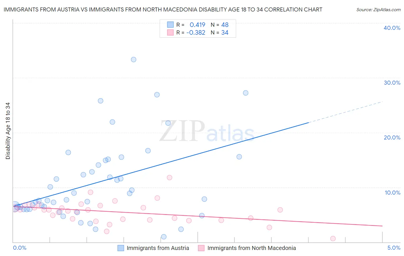 Immigrants from Austria vs Immigrants from North Macedonia Disability Age 18 to 34 Correlation Chart