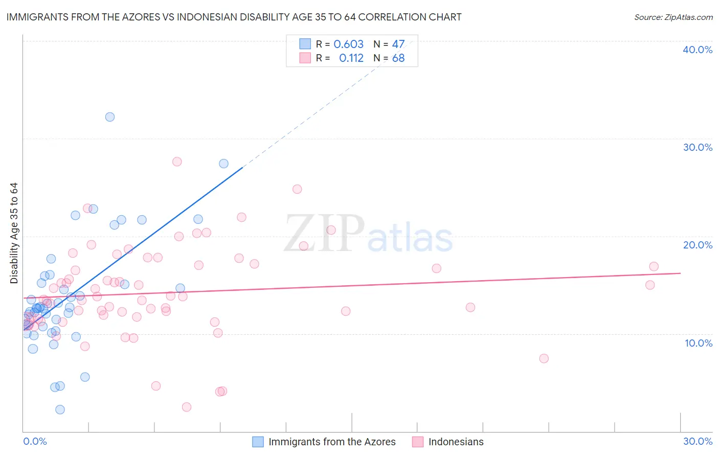 Immigrants from the Azores vs Indonesian Disability Age 35 to 64 Correlation Chart