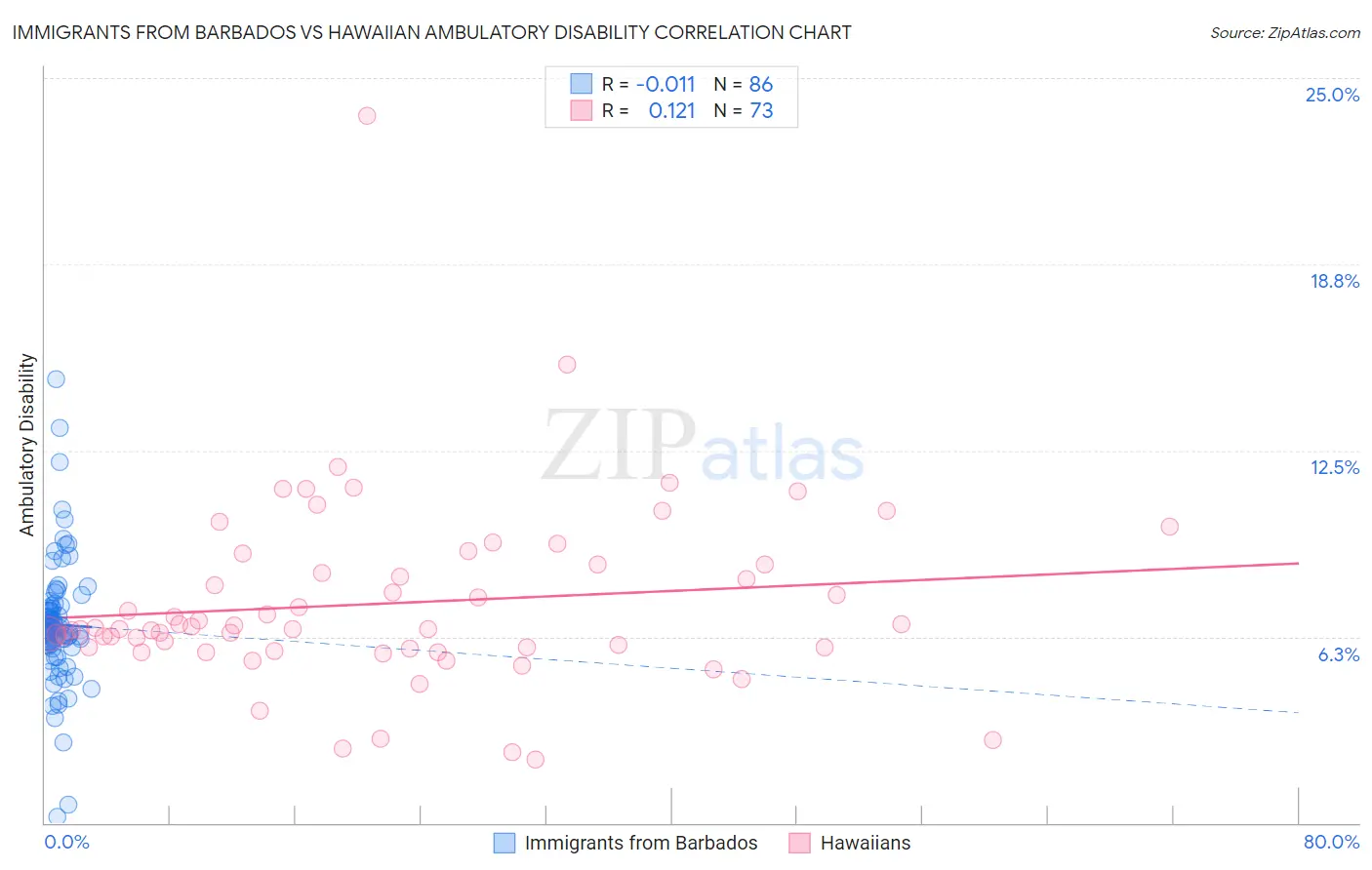 Immigrants from Barbados vs Hawaiian Ambulatory Disability Correlation Chart