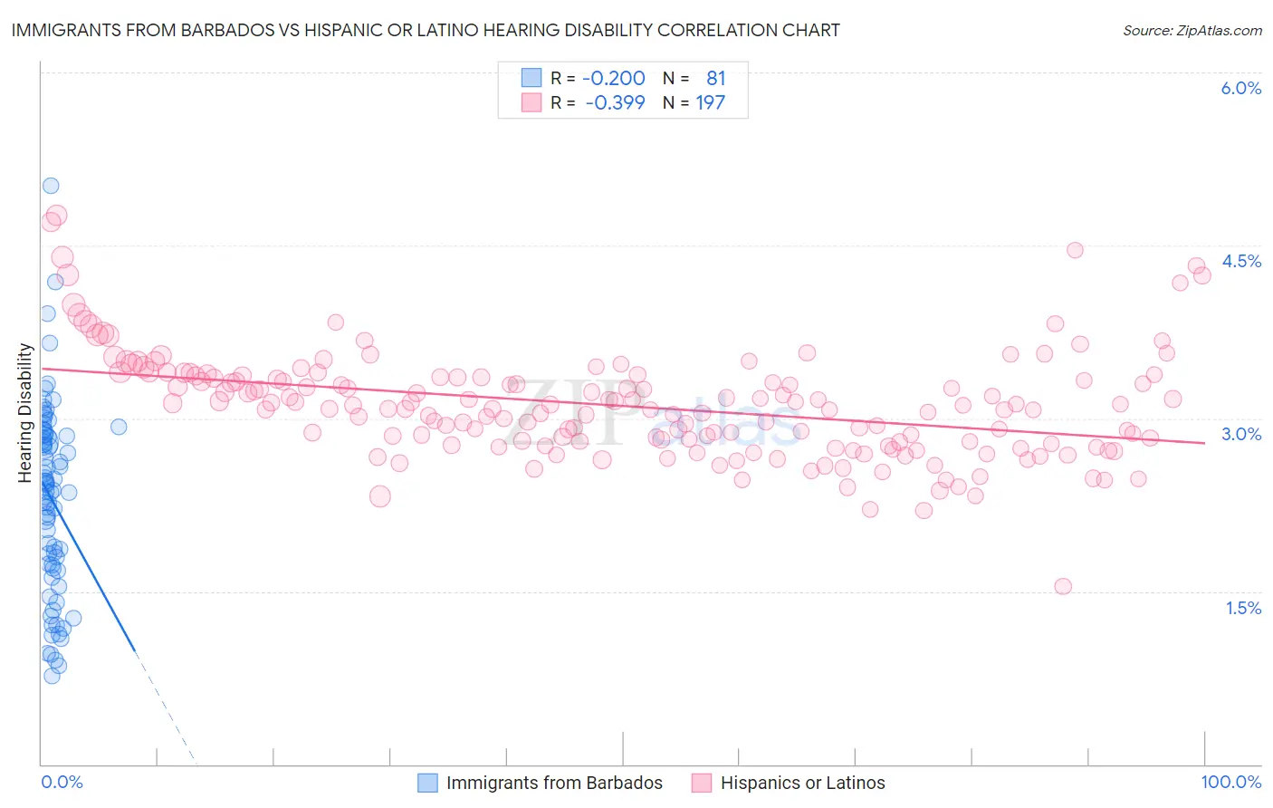 Immigrants from Barbados vs Hispanic or Latino Hearing Disability Correlation Chart