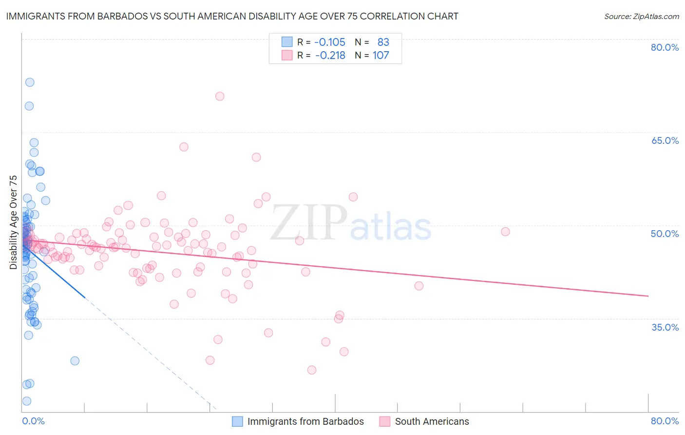Immigrants from Barbados vs South American Disability Age Over 75 Correlation Chart