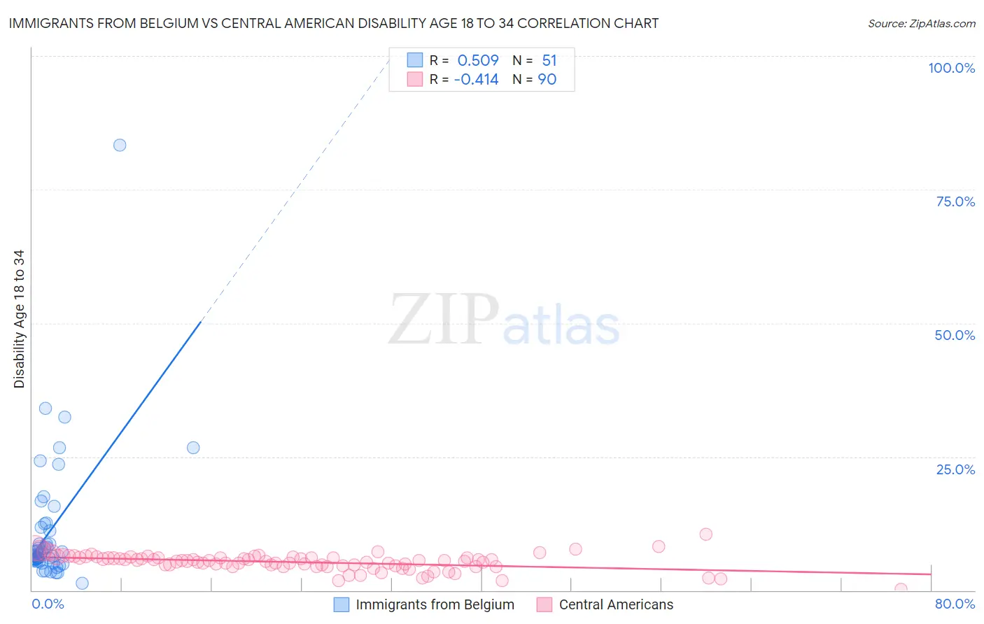 Immigrants from Belgium vs Central American Disability Age 18 to 34 Correlation Chart