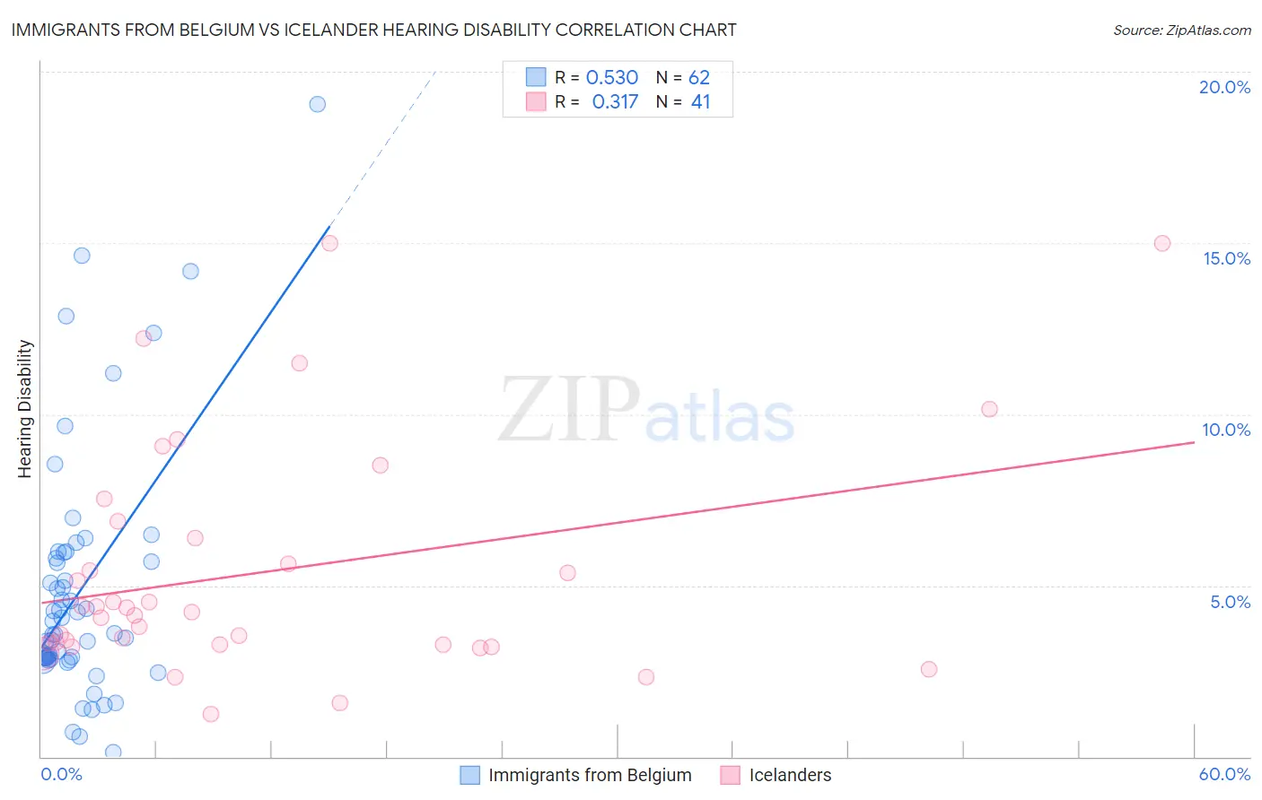 Immigrants from Belgium vs Icelander Hearing Disability Correlation Chart
