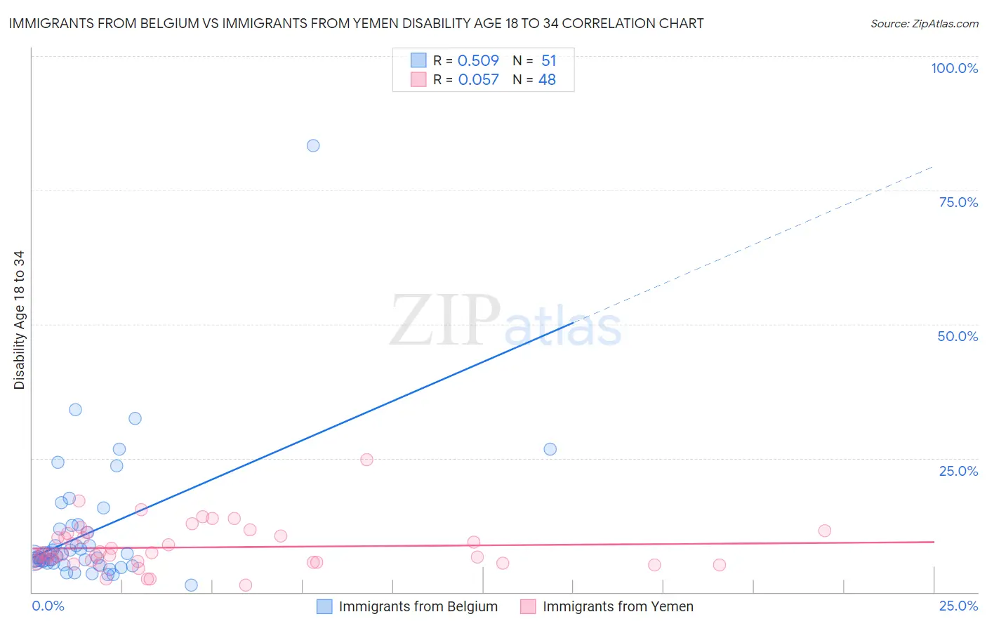Immigrants from Belgium vs Immigrants from Yemen Disability Age 18 to 34 Correlation Chart