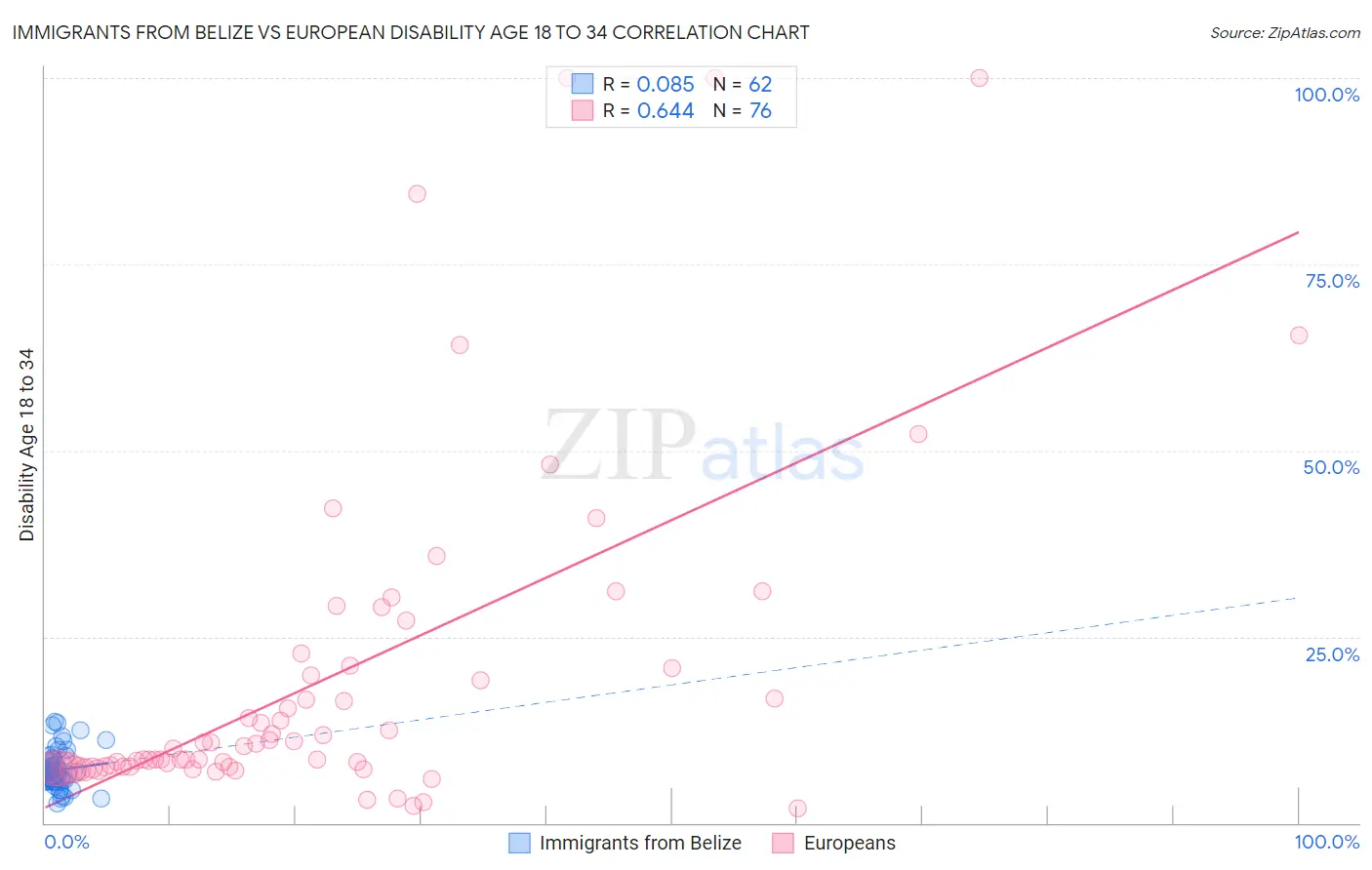 Immigrants from Belize vs European Disability Age 18 to 34 Correlation Chart
