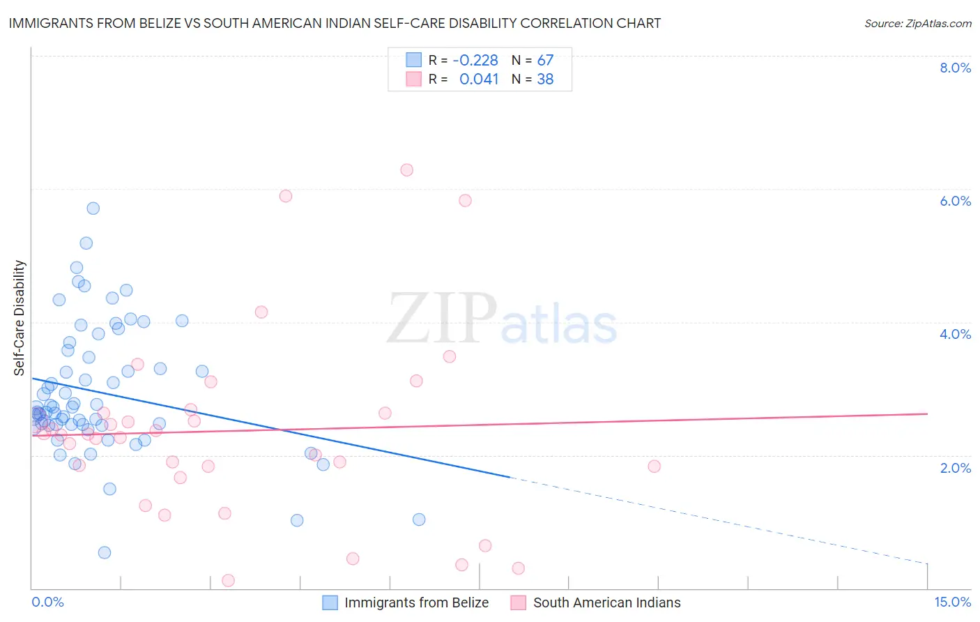 Immigrants from Belize vs South American Indian Self-Care Disability Correlation Chart