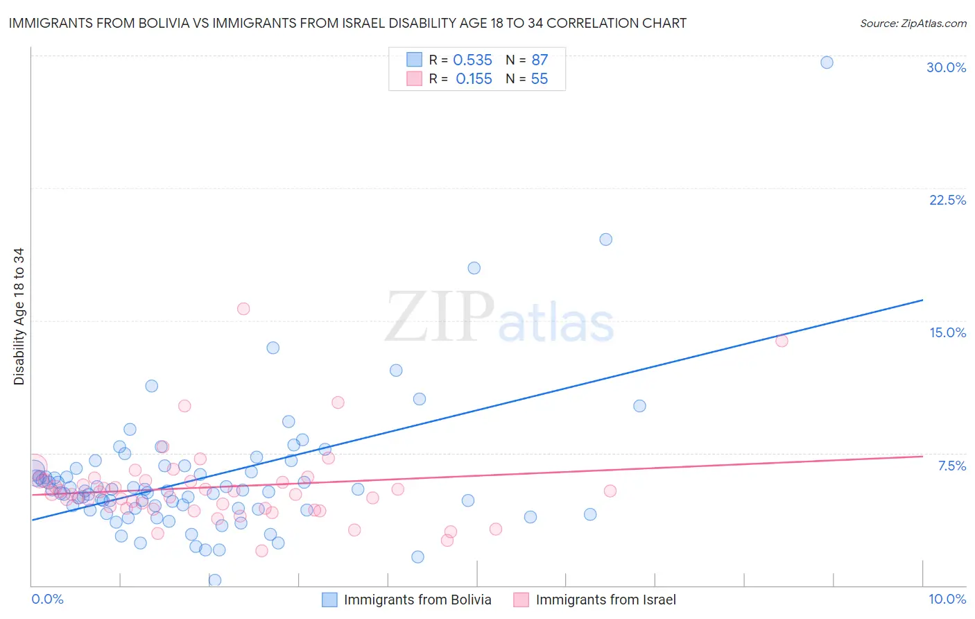 Immigrants from Bolivia vs Immigrants from Israel Disability Age 18 to 34 Correlation Chart