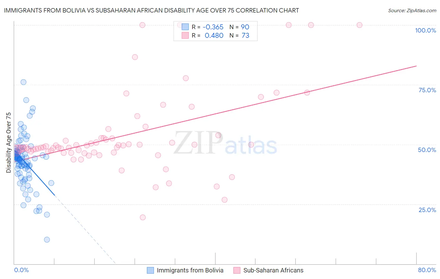 Immigrants from Bolivia vs Subsaharan African Disability Age Over 75 Correlation Chart