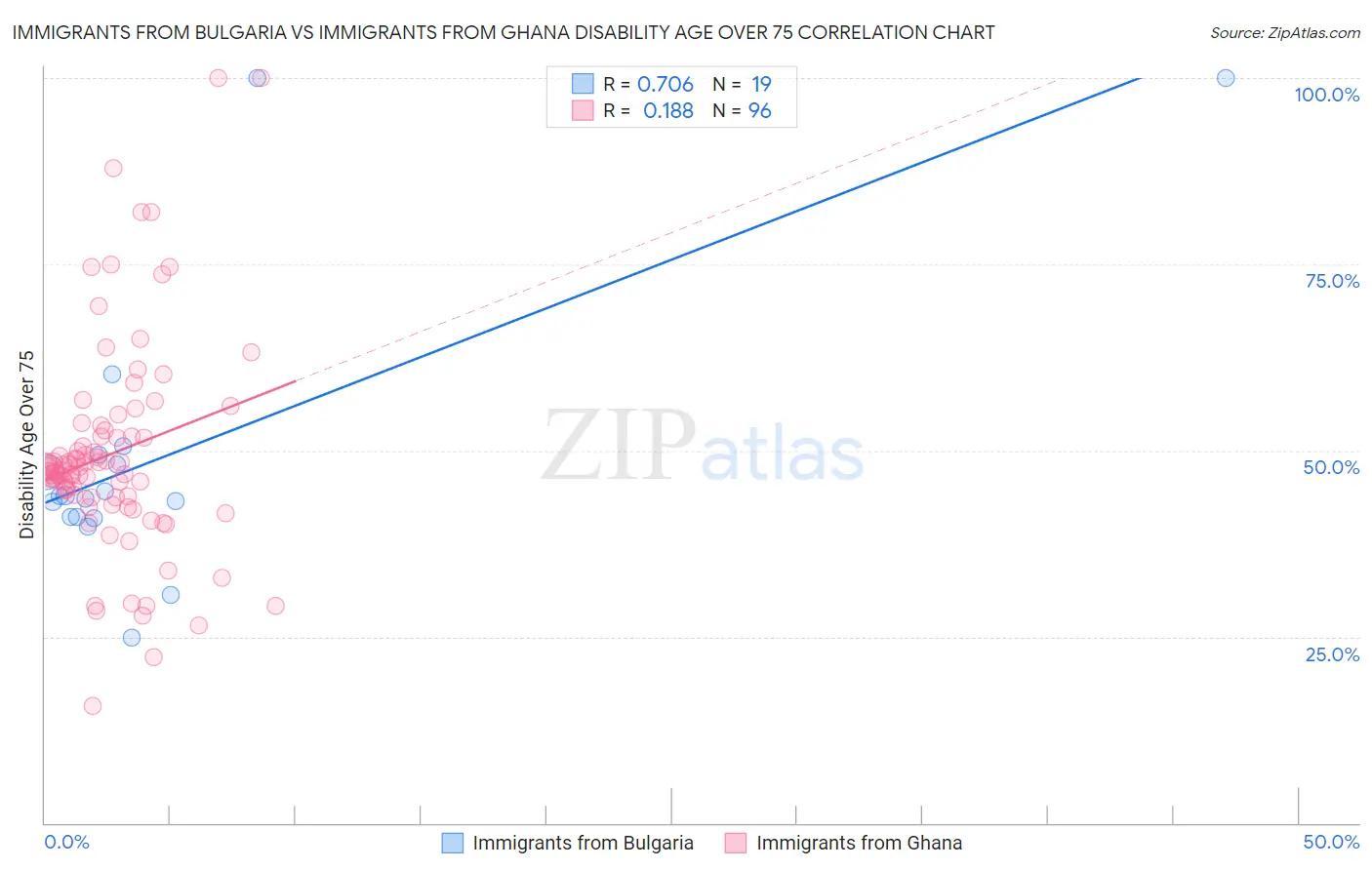 Immigrants from Bulgaria vs Immigrants from Ghana Disability Age Over 75 Correlation Chart