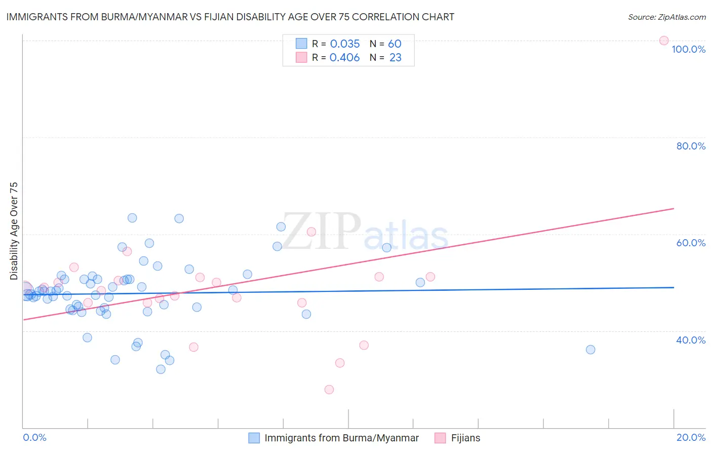 Immigrants from Burma/Myanmar vs Fijian Disability Age Over 75 Correlation Chart