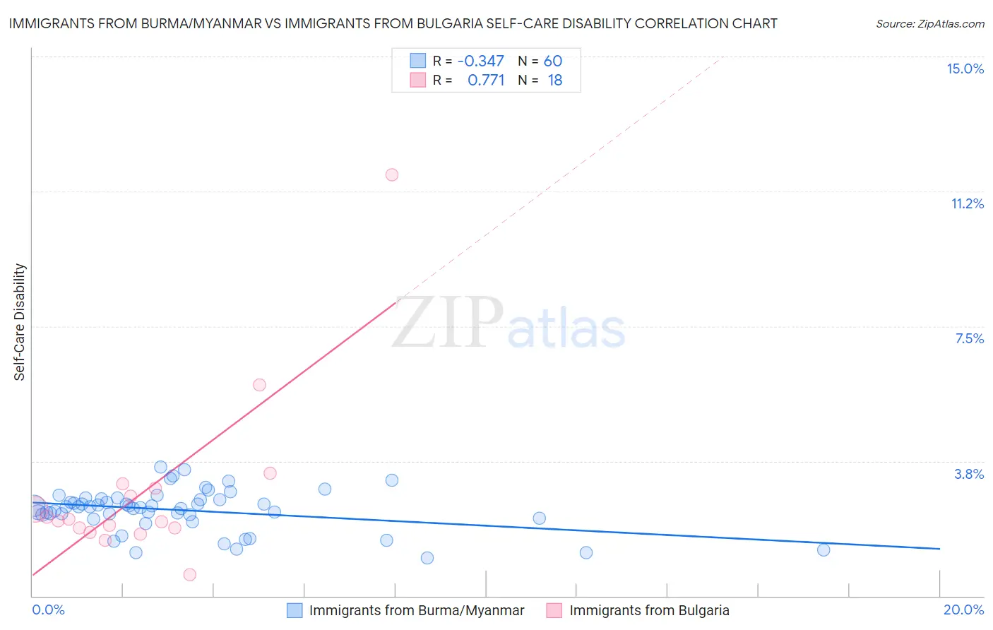 Immigrants from Burma/Myanmar vs Immigrants from Bulgaria Self-Care Disability Correlation Chart
