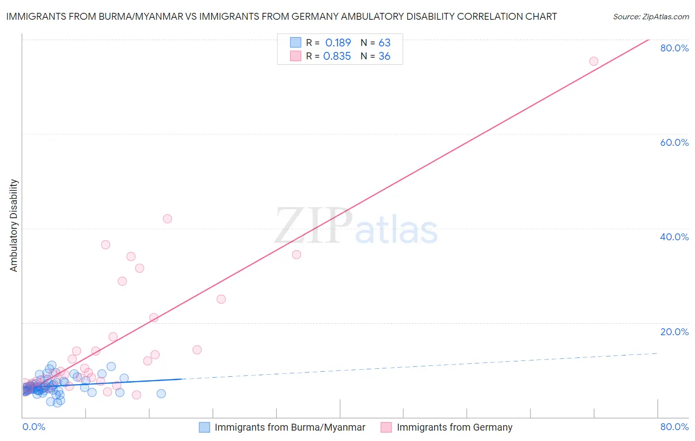 Immigrants from Burma/Myanmar vs Immigrants from Germany Ambulatory Disability Correlation Chart