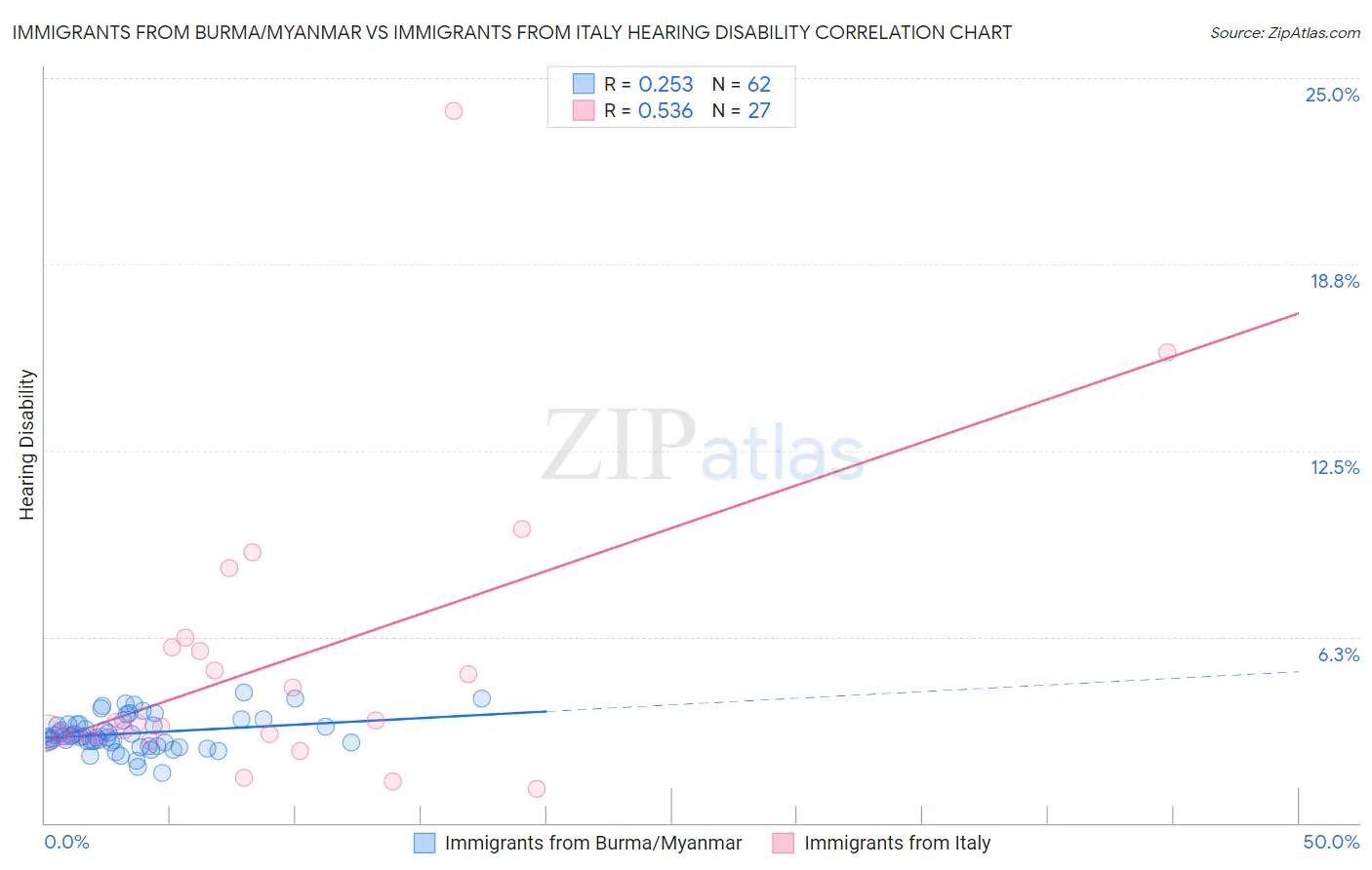 Immigrants from Burma/Myanmar vs Immigrants from Italy Hearing Disability Correlation Chart