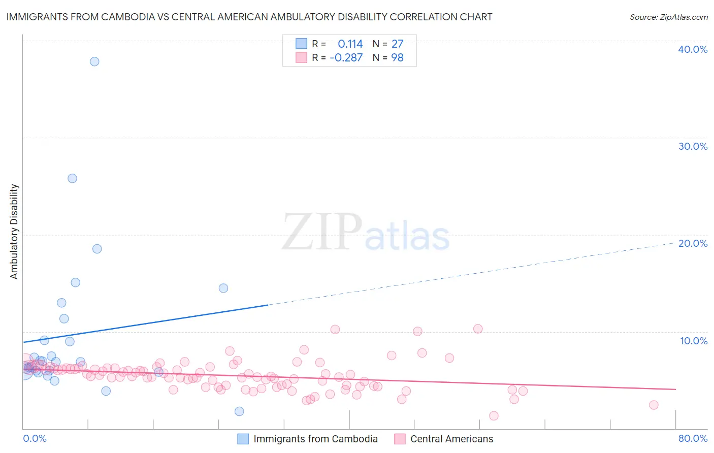 Immigrants from Cambodia vs Central American Ambulatory Disability Correlation Chart