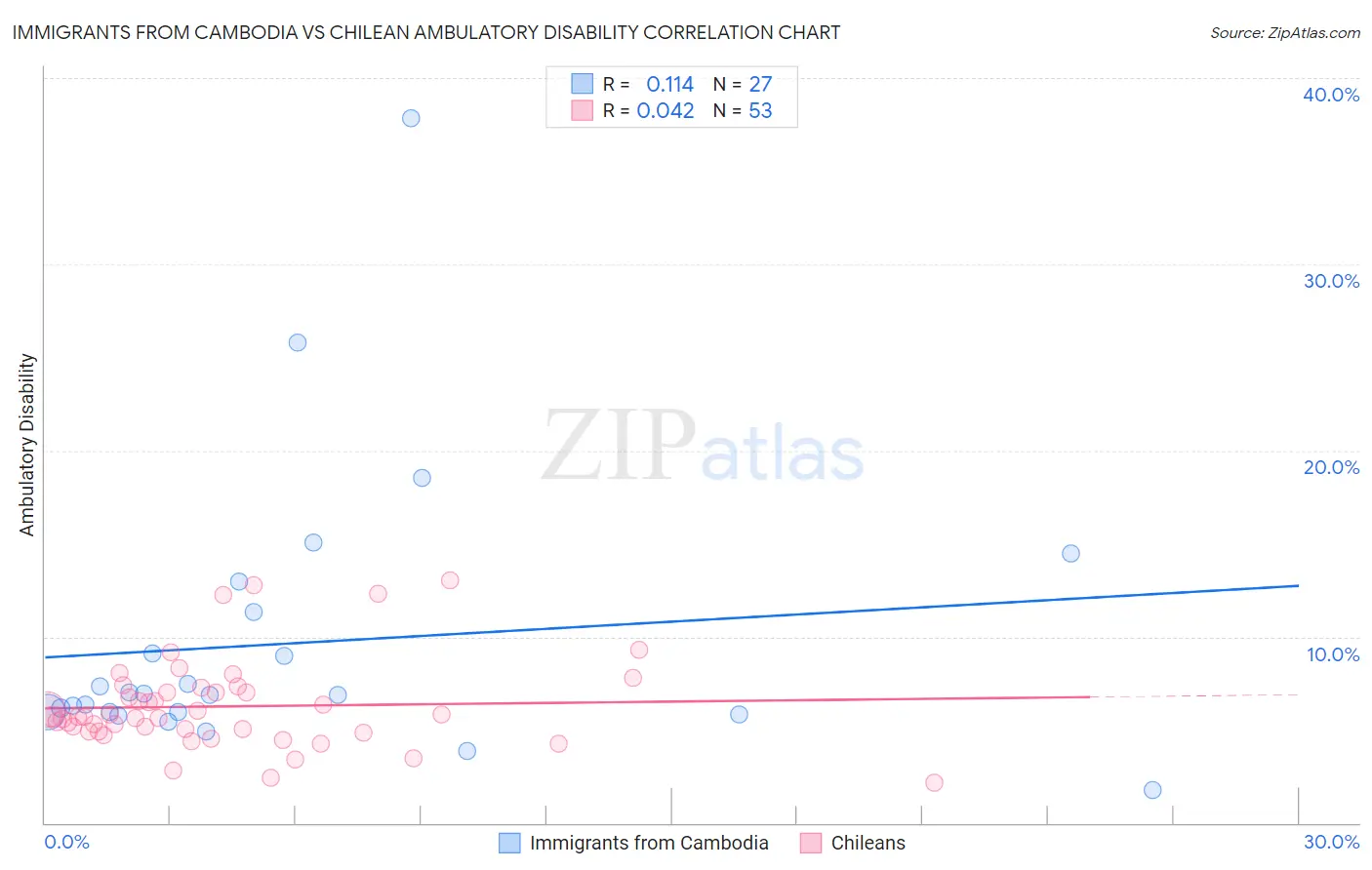 Immigrants from Cambodia vs Chilean Ambulatory Disability Correlation Chart