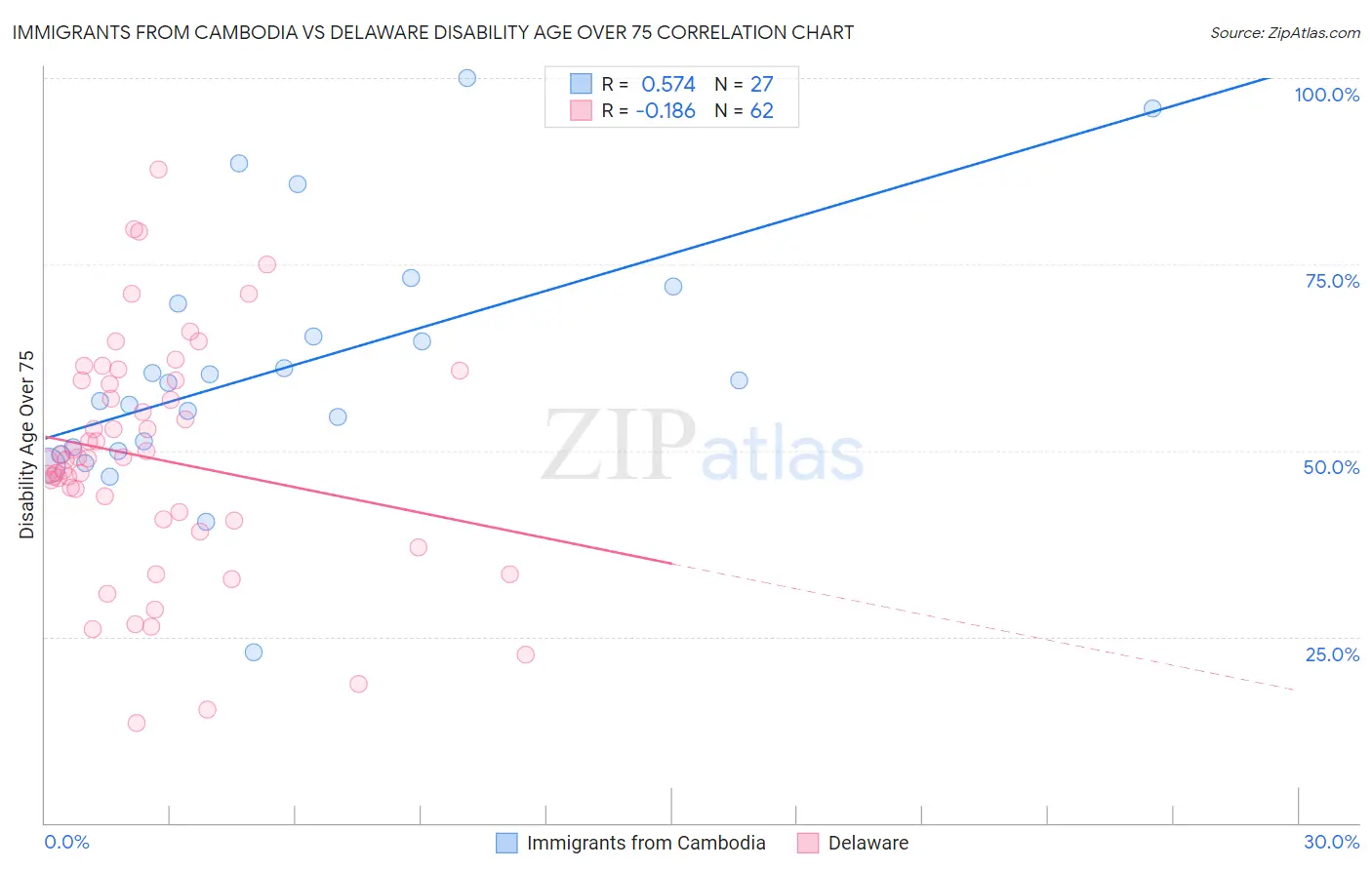 Immigrants from Cambodia vs Delaware Disability Age Over 75 Correlation Chart