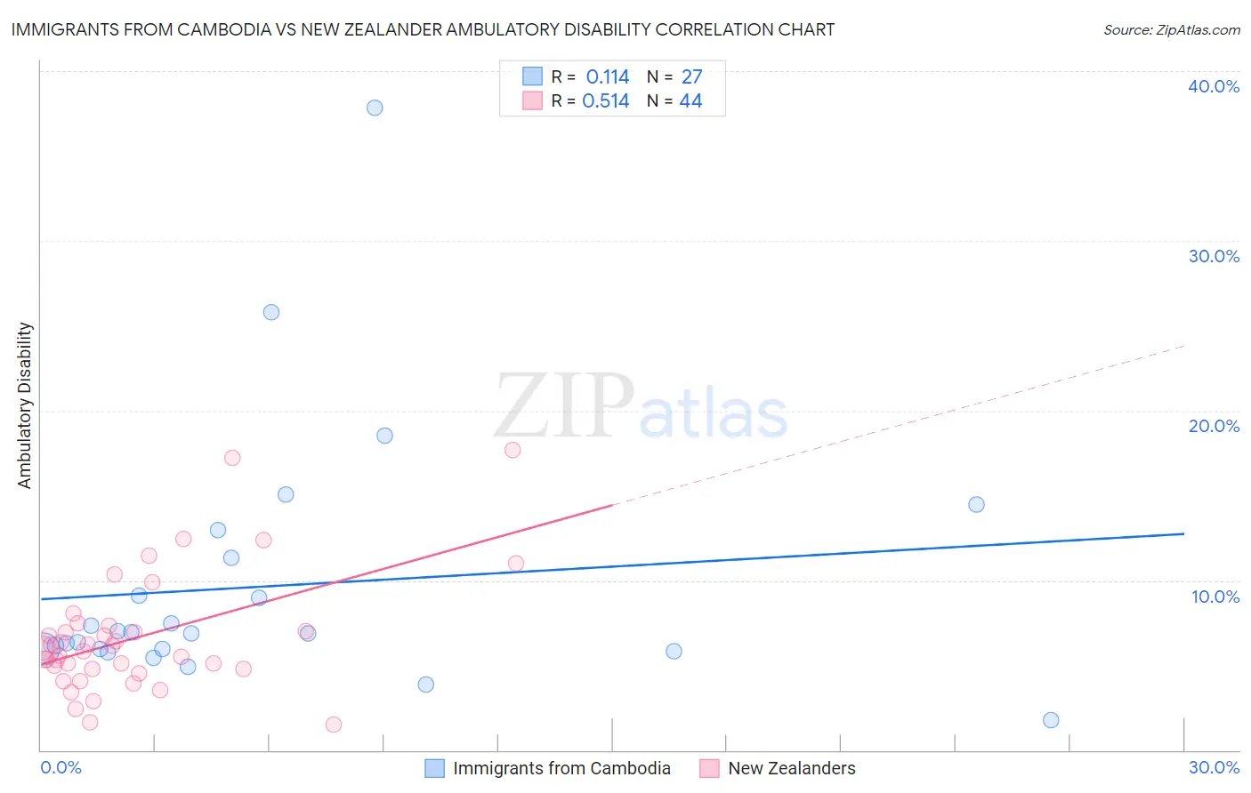 Immigrants from Cambodia vs New Zealander Ambulatory Disability Correlation Chart