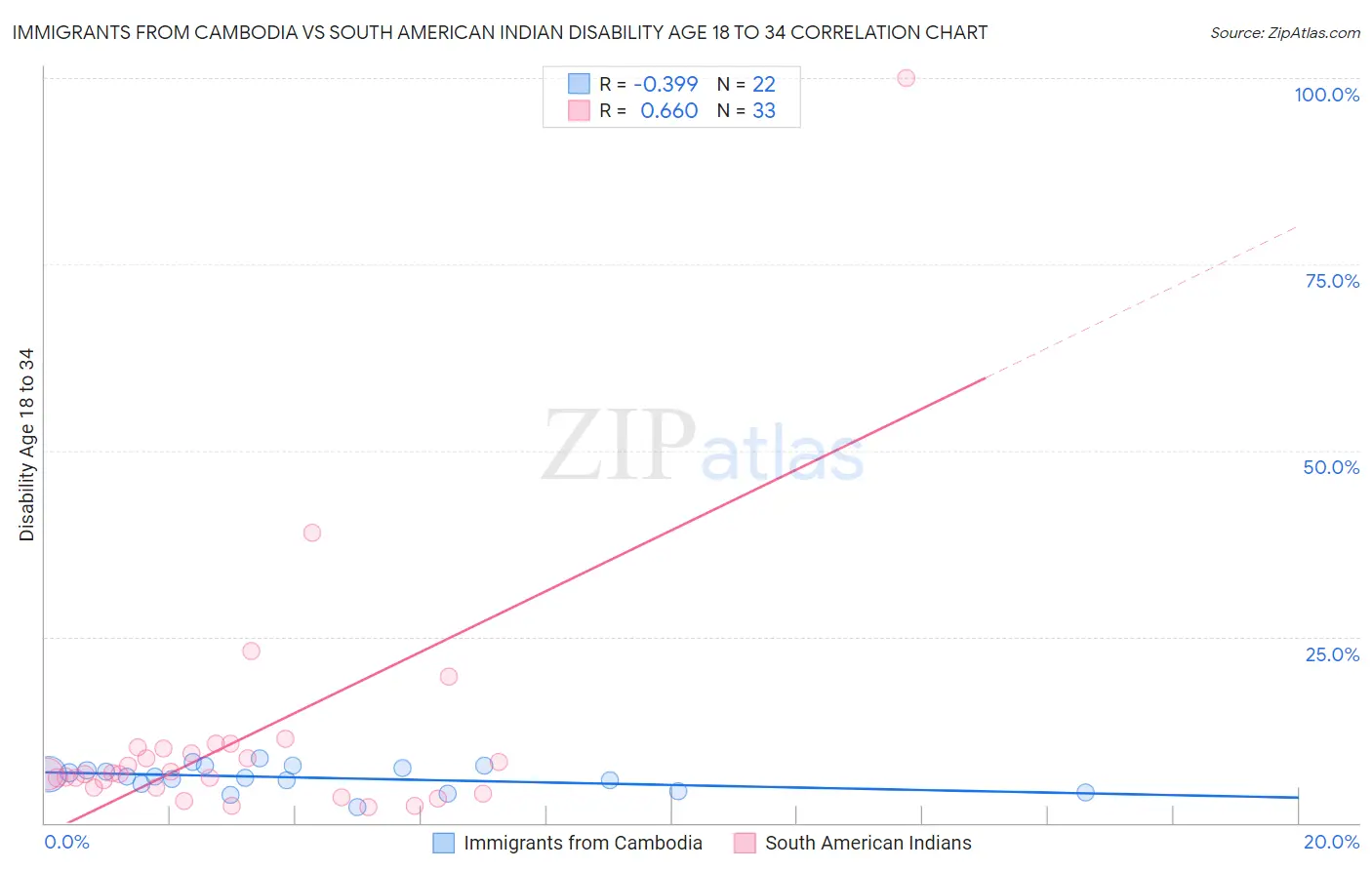 Immigrants from Cambodia vs South American Indian Disability Age 18 to 34 Correlation Chart