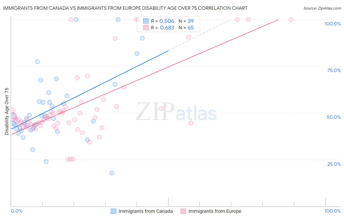Immigrants from Canada vs Immigrants from Europe Disability Age Over 75 Correlation Chart