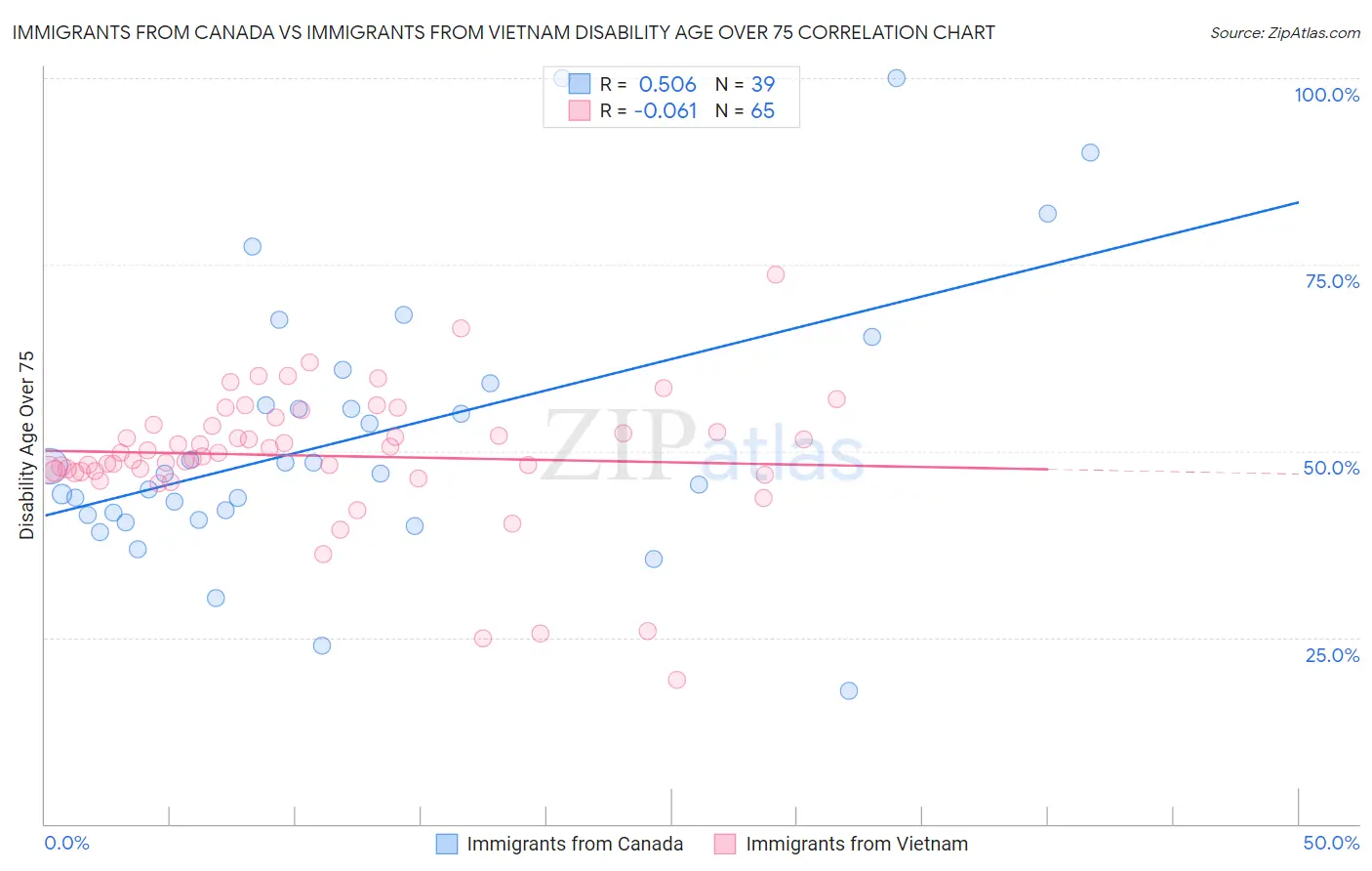 Immigrants from Canada vs Immigrants from Vietnam Disability Age Over 75 Correlation Chart