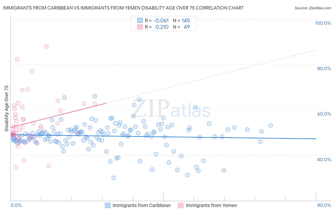 Immigrants from Caribbean vs Immigrants from Yemen Disability Age Over 75 Correlation Chart