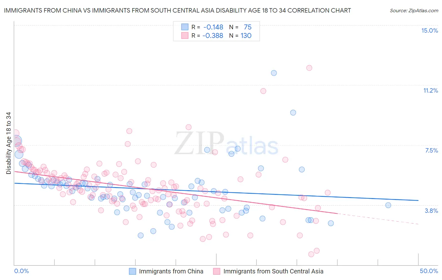 Immigrants from China vs Immigrants from South Central Asia Disability Age 18 to 34 Correlation Chart