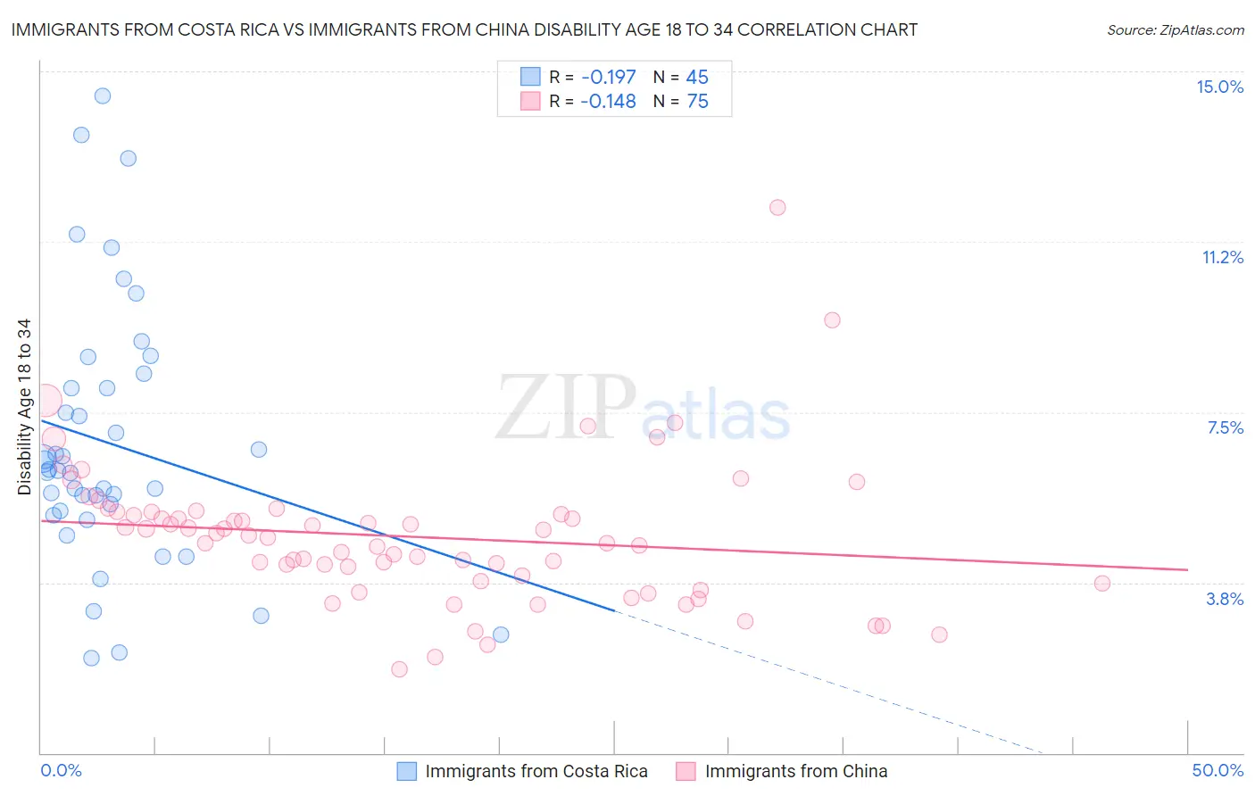 Immigrants from Costa Rica vs Immigrants from China Disability Age 18 to 34 Correlation Chart
