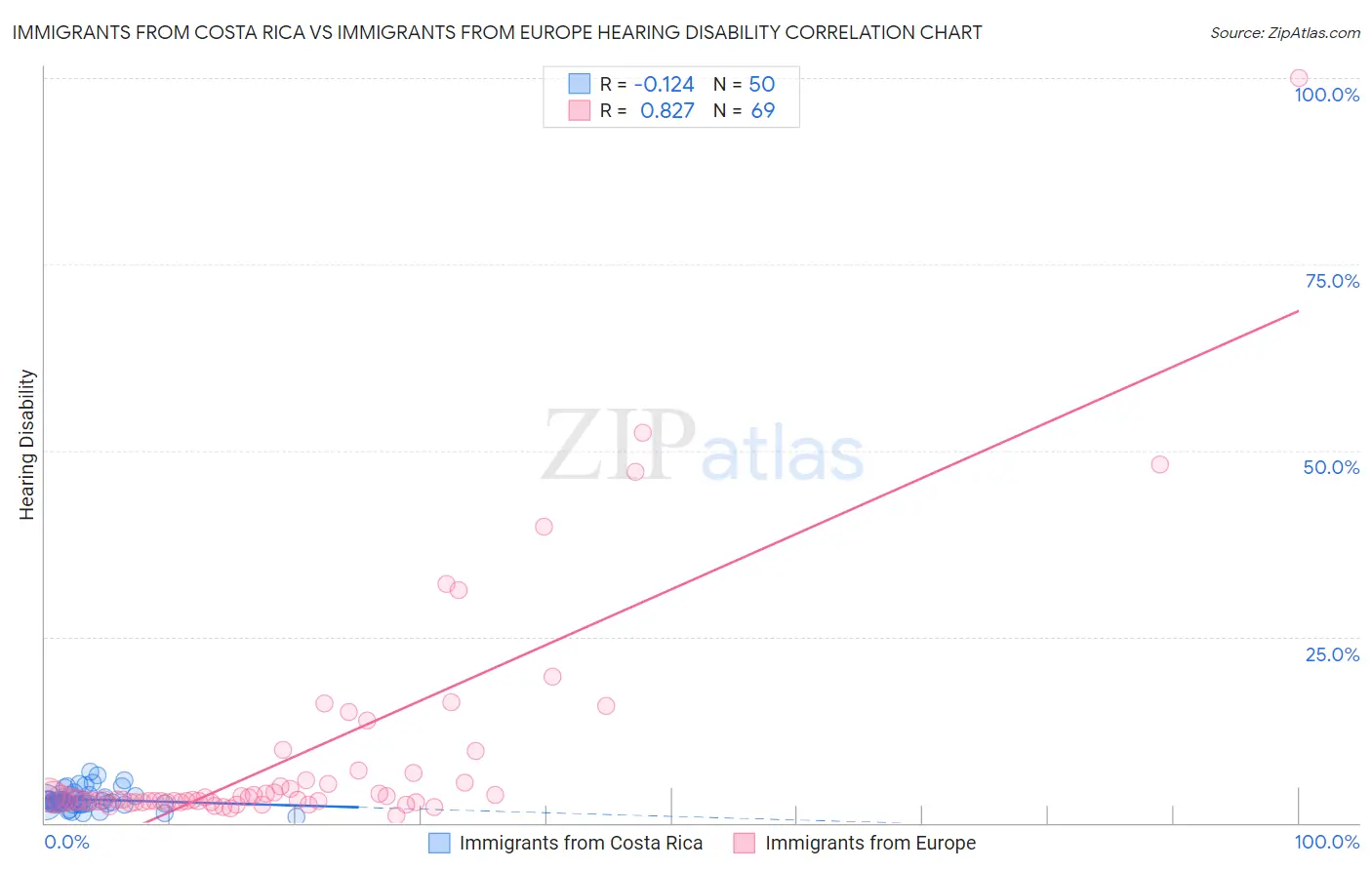 Immigrants from Costa Rica vs Immigrants from Europe Hearing Disability Correlation Chart