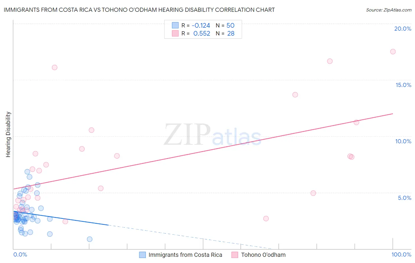 Immigrants from Costa Rica vs Tohono O'odham Hearing Disability Correlation Chart