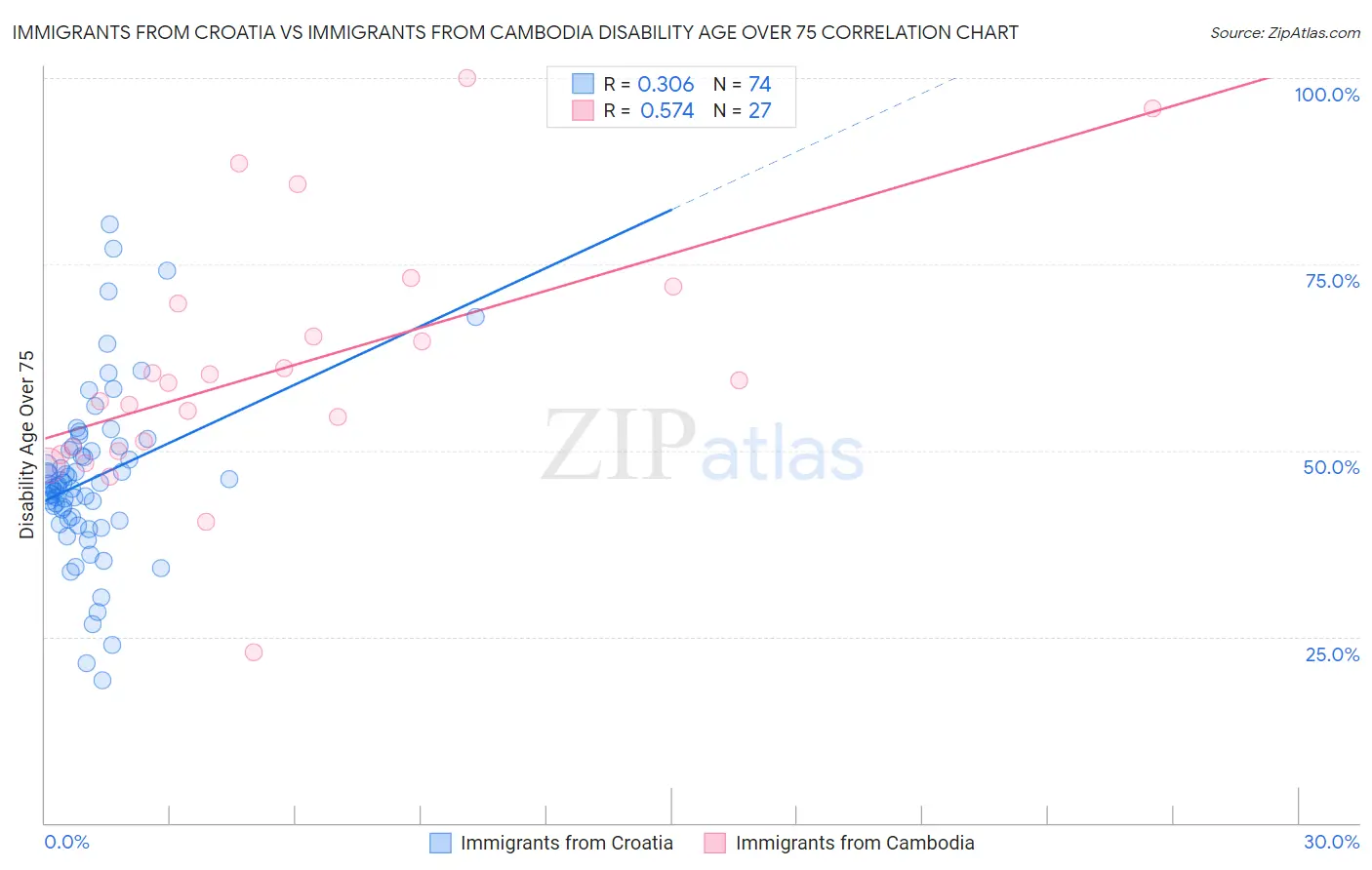 Immigrants from Croatia vs Immigrants from Cambodia Disability Age Over 75 Correlation Chart