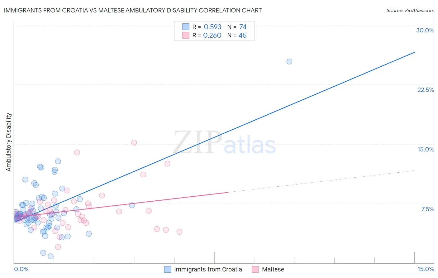 Immigrants from Croatia vs Maltese Ambulatory Disability Correlation Chart