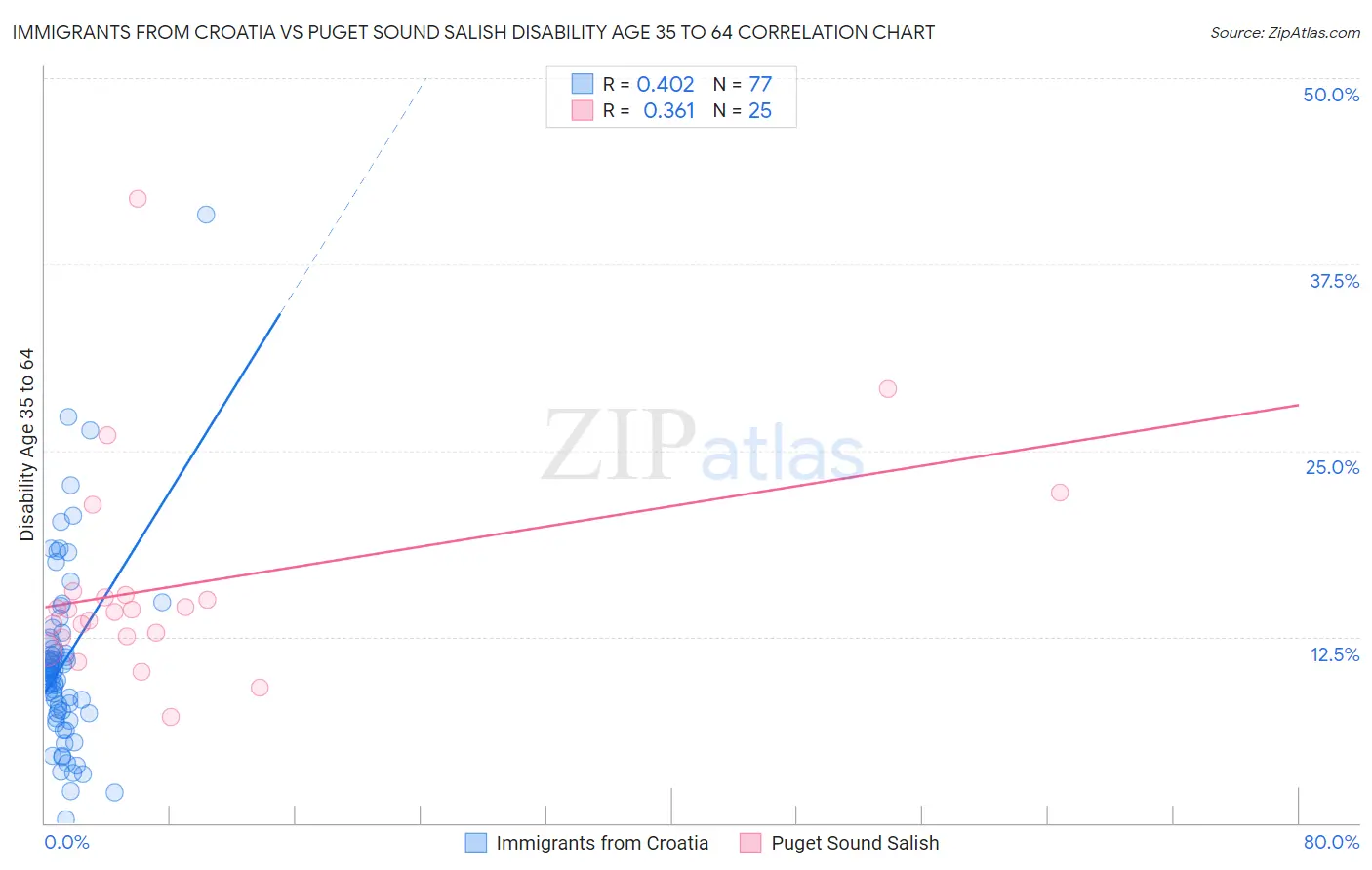 Immigrants from Croatia vs Puget Sound Salish Disability Age 35 to 64 Correlation Chart
