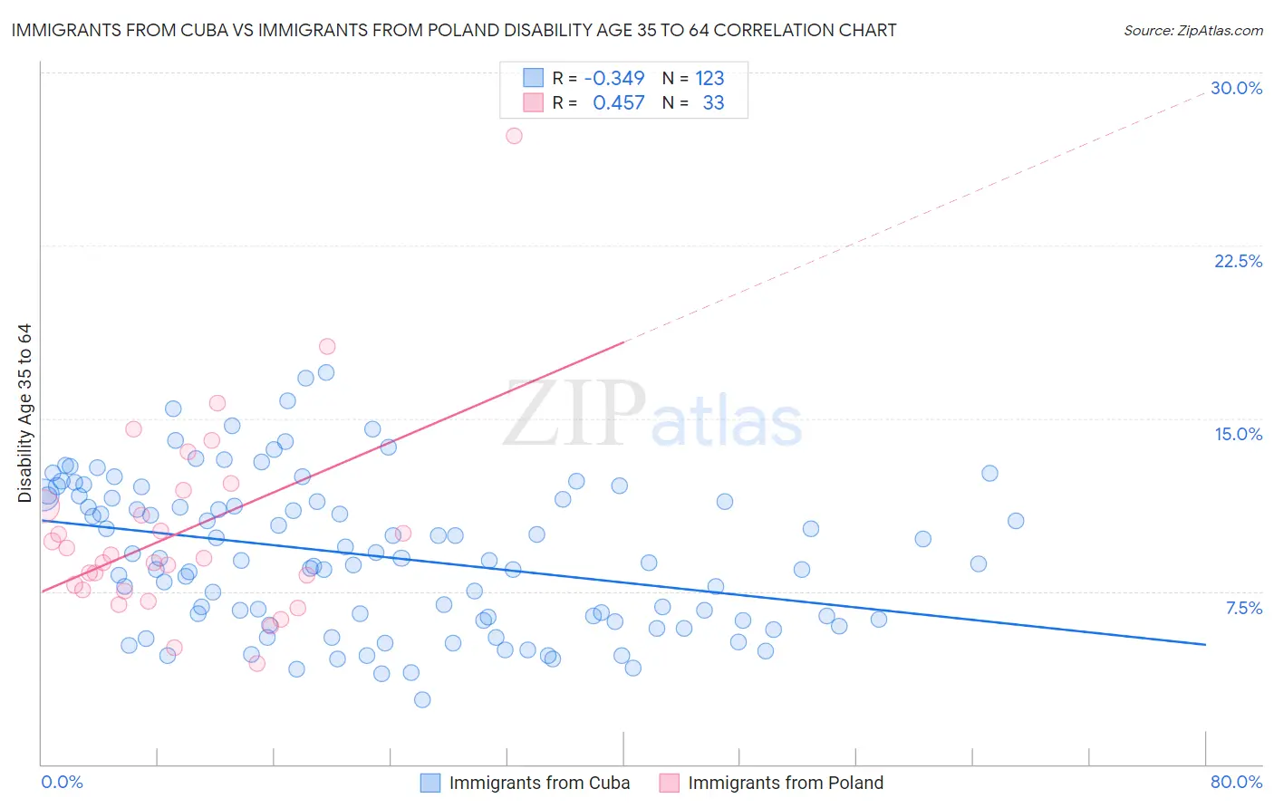 Immigrants from Cuba vs Immigrants from Poland Disability Age 35 to 64 Correlation Chart