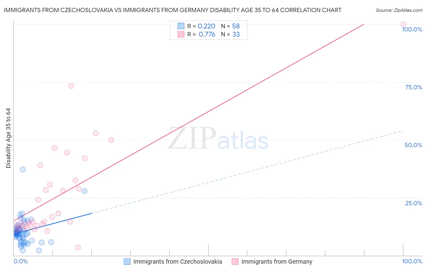 Immigrants from Czechoslovakia vs Immigrants from Germany Disability Age 35 to 64 Correlation Chart