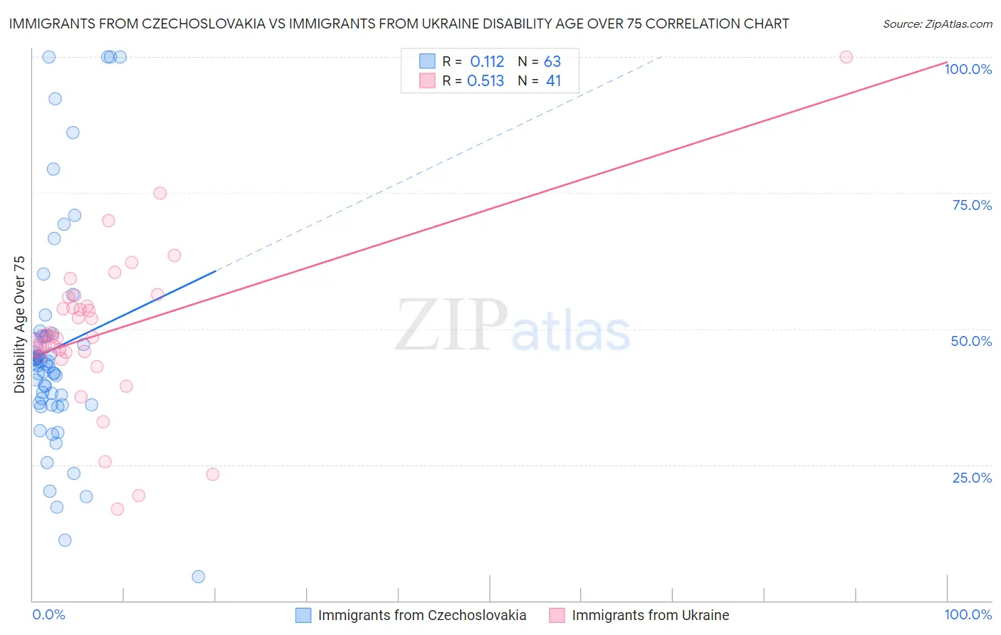 Immigrants from Czechoslovakia vs Immigrants from Ukraine Disability Age Over 75 Correlation Chart