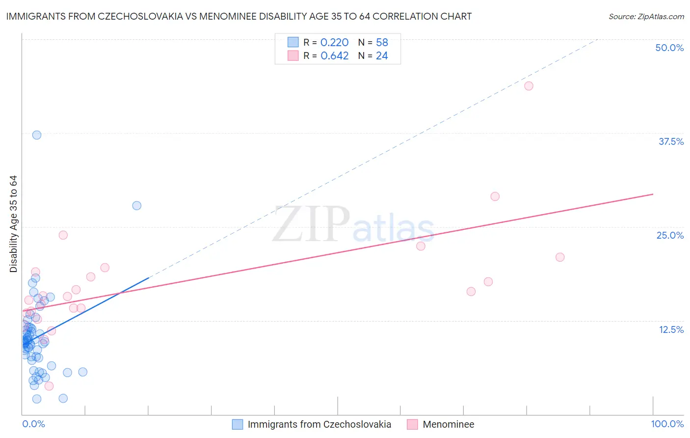 Immigrants from Czechoslovakia vs Menominee Disability Age 35 to 64 Correlation Chart