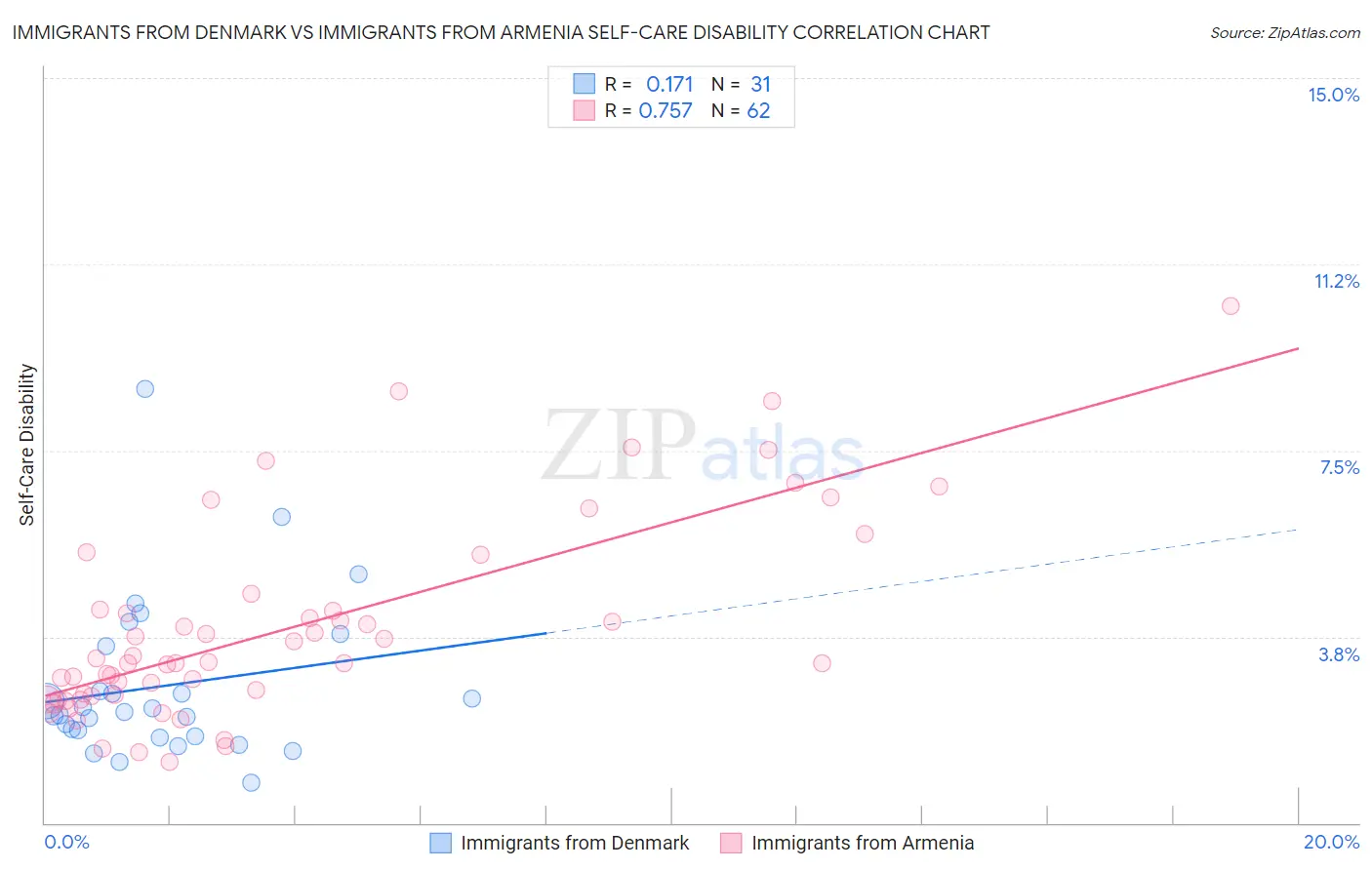Immigrants from Denmark vs Immigrants from Armenia Self-Care Disability Correlation Chart