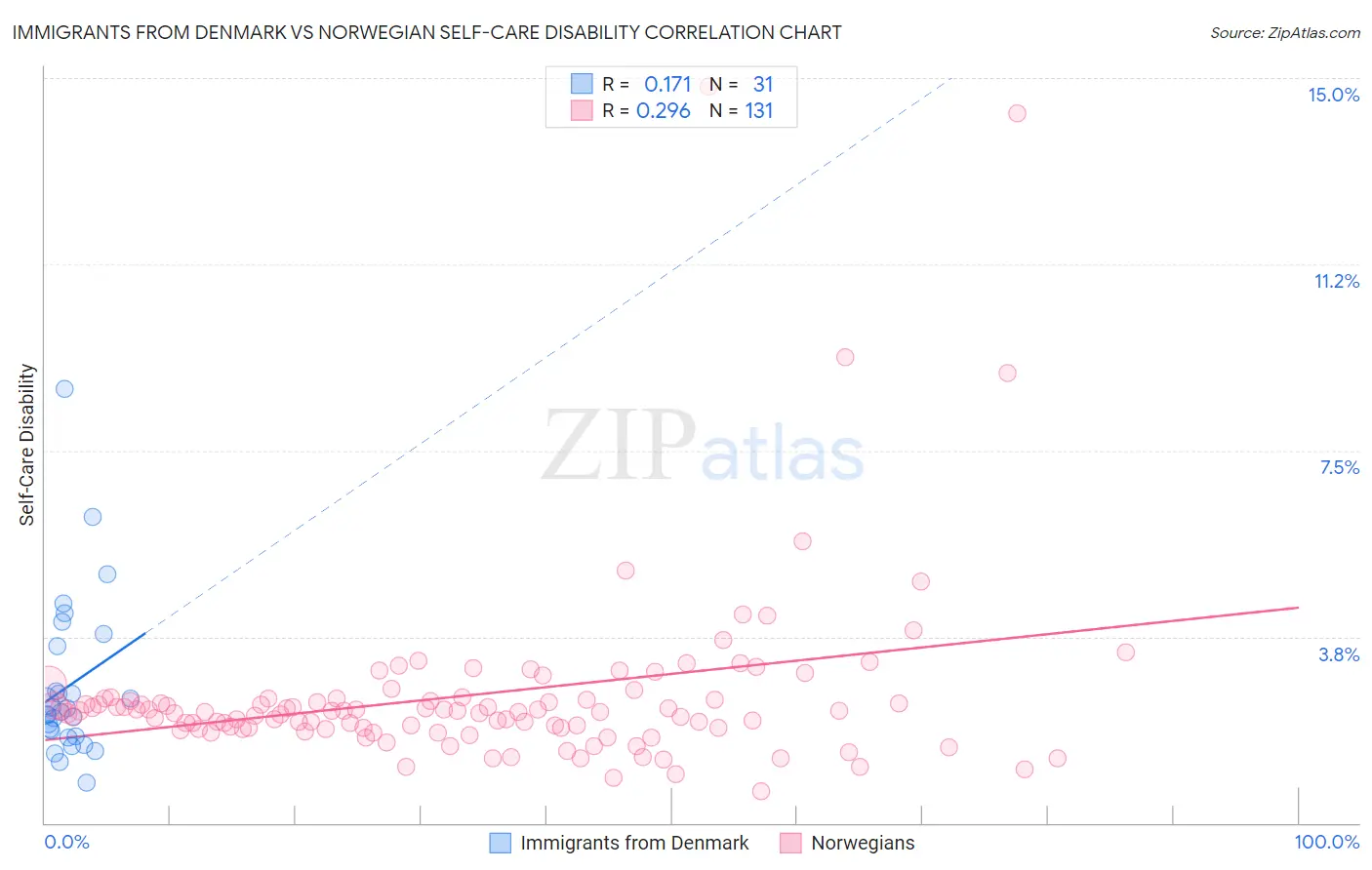 Immigrants from Denmark vs Norwegian Self-Care Disability Correlation Chart