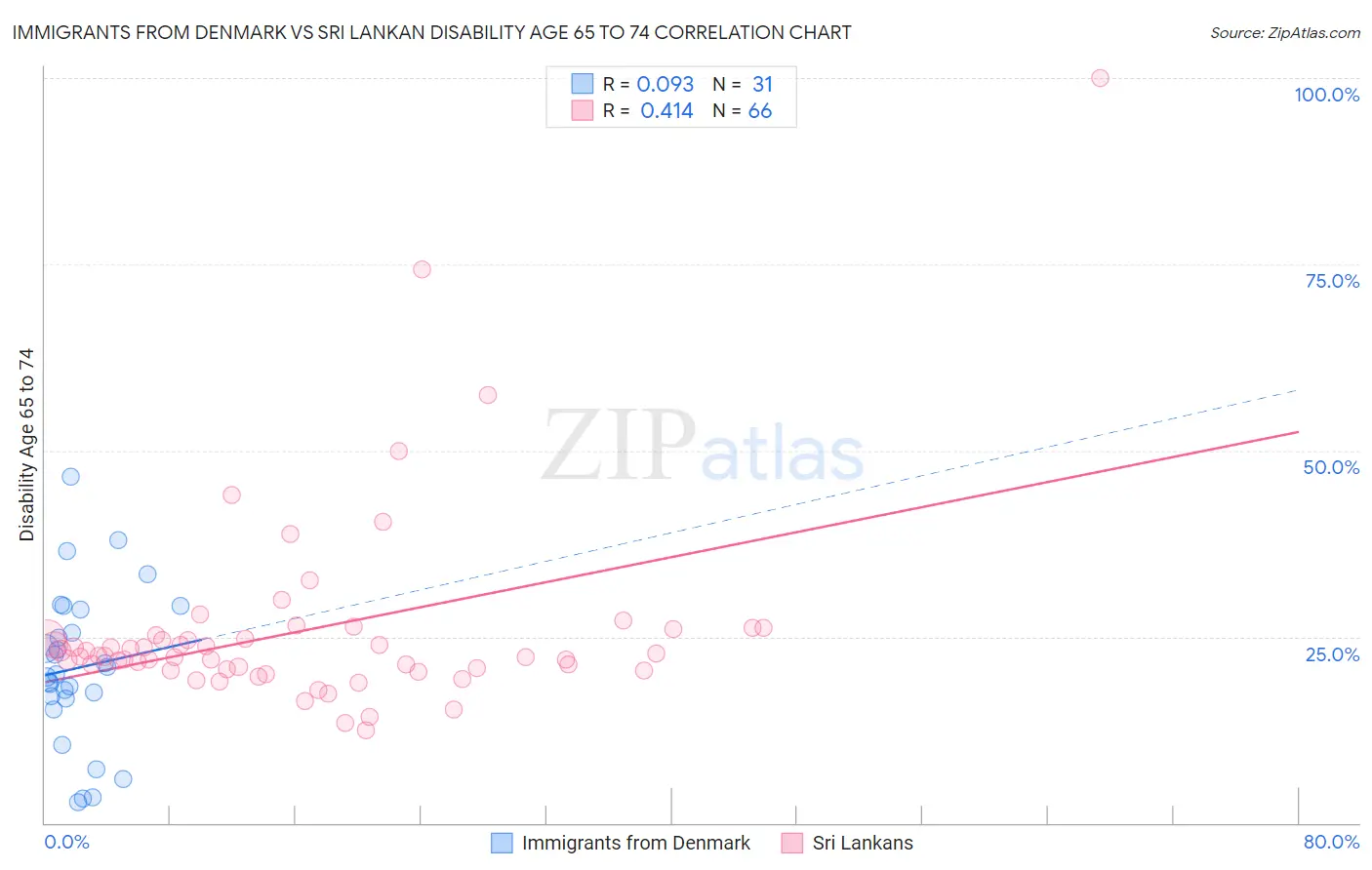 Immigrants from Denmark vs Sri Lankan Disability Age 65 to 74 Correlation Chart
