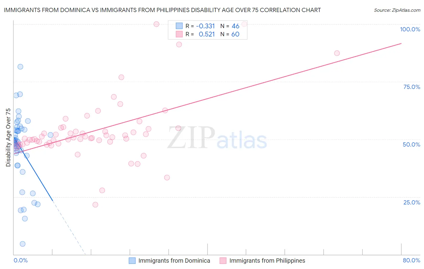 Immigrants from Dominica vs Immigrants from Philippines Disability Age Over 75 Correlation Chart