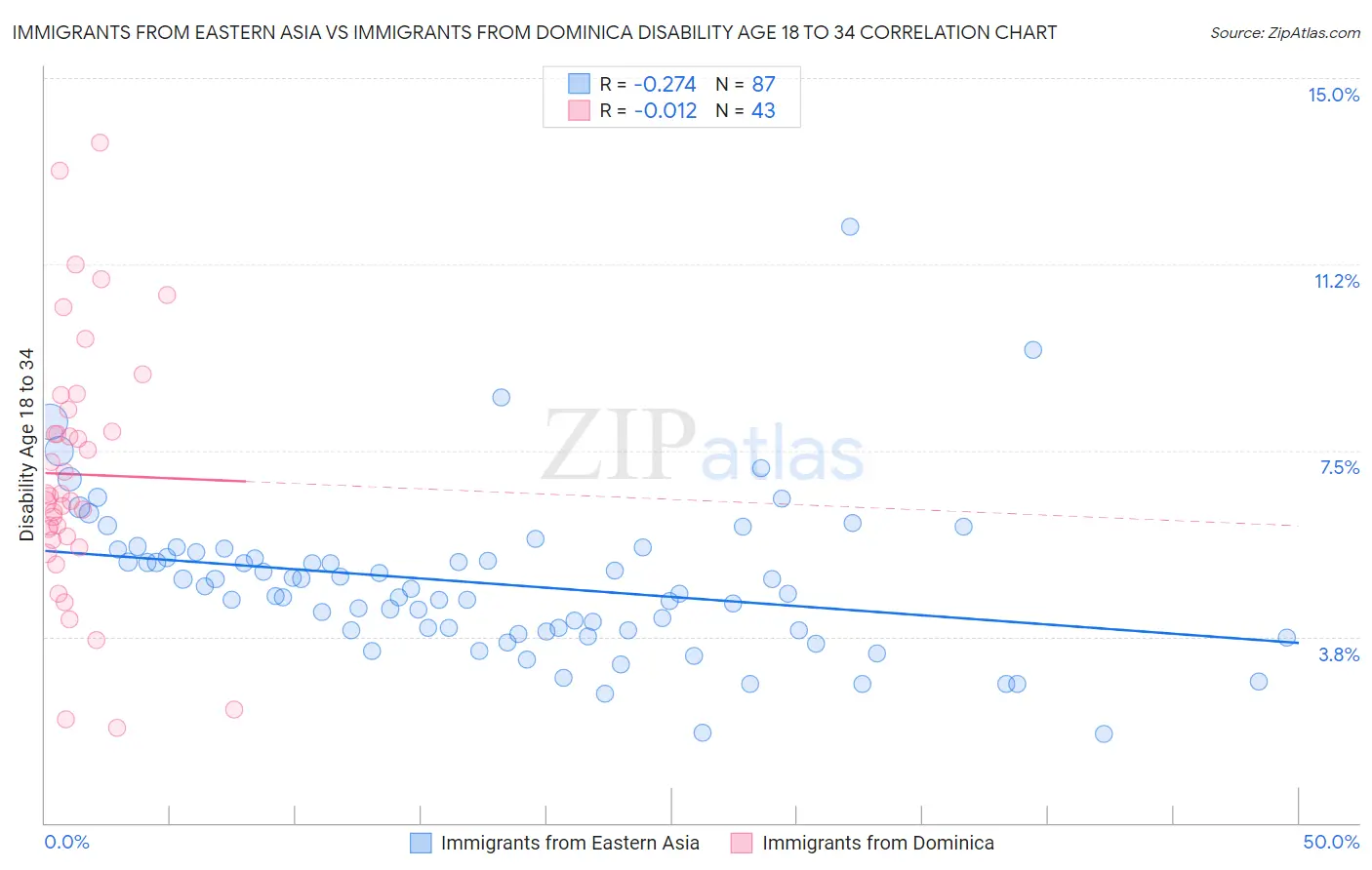 Immigrants from Eastern Asia vs Immigrants from Dominica Disability Age 18 to 34 Correlation Chart