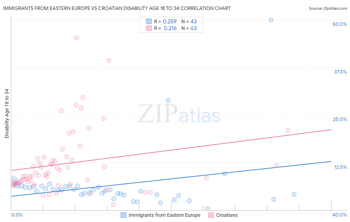 Immigrants from Eastern Europe vs Croatian Disability Age 18 to 34 Correlation Chart