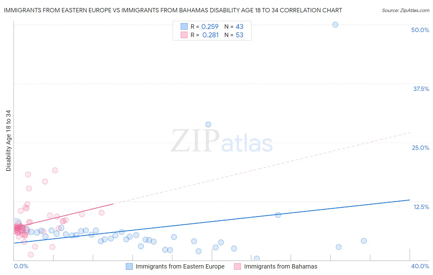 Immigrants from Eastern Europe vs Immigrants from Bahamas Disability Age 18 to 34 Correlation Chart