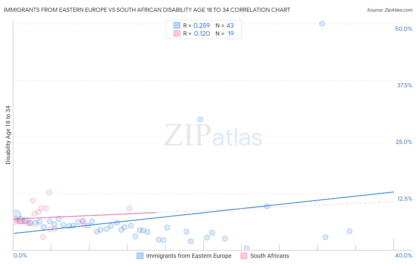 Immigrants from Eastern Europe vs South African Disability Age 18 to 34 Correlation Chart