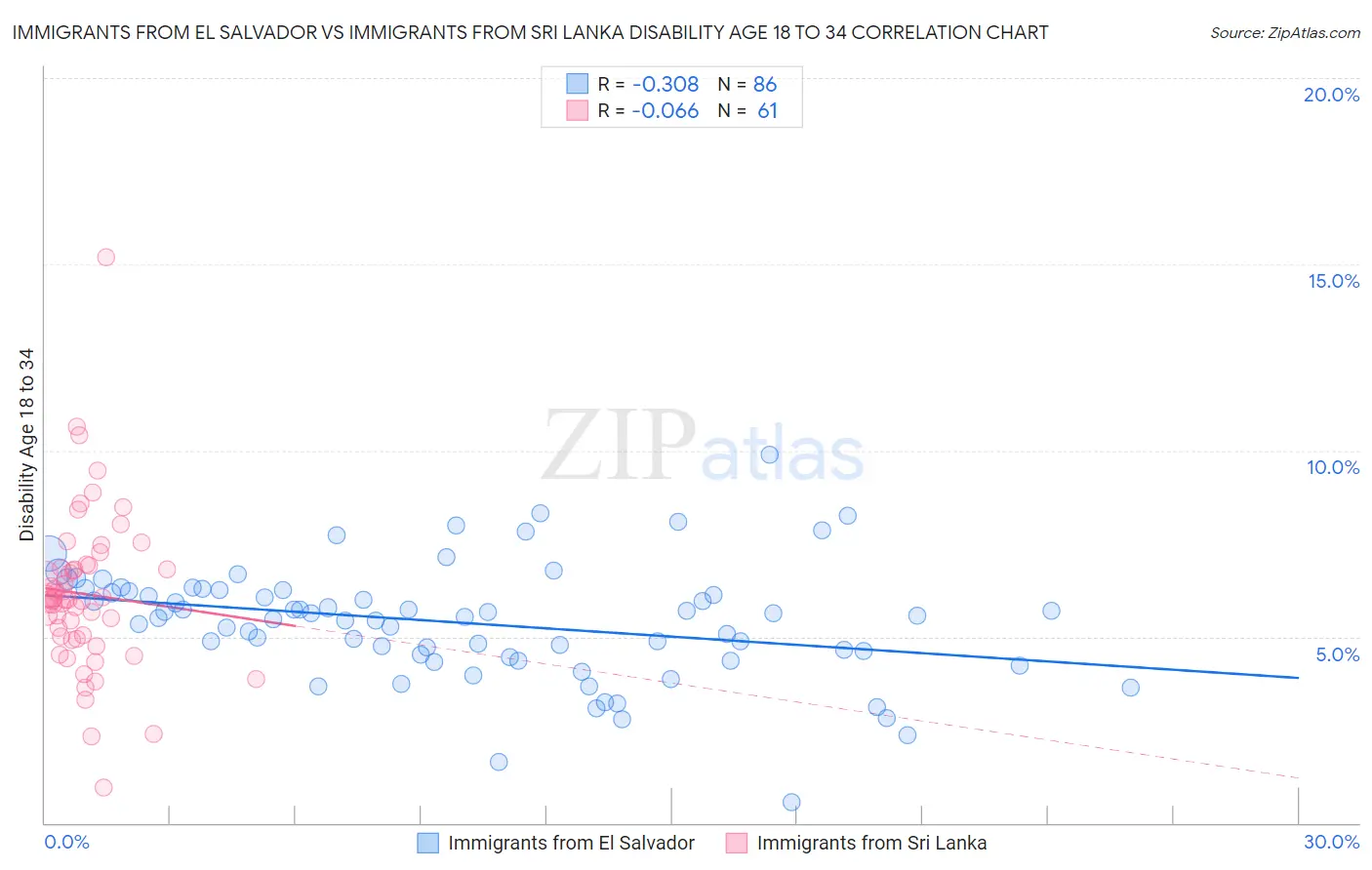 Immigrants from El Salvador vs Immigrants from Sri Lanka Disability Age 18 to 34 Correlation Chart