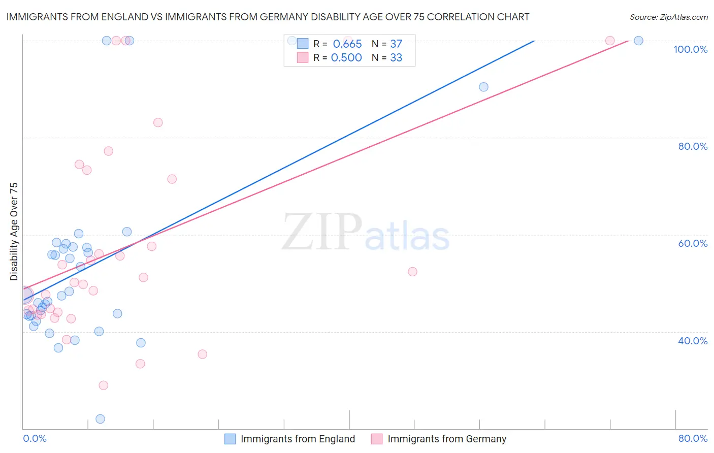 Immigrants from England vs Immigrants from Germany Disability Age Over 75 Correlation Chart